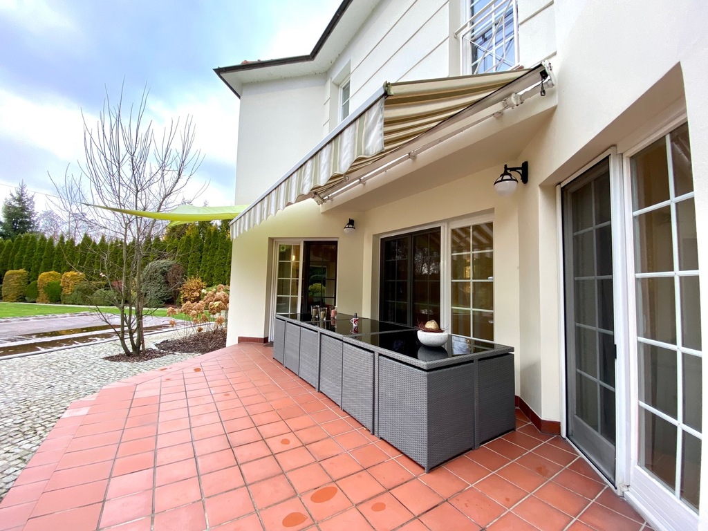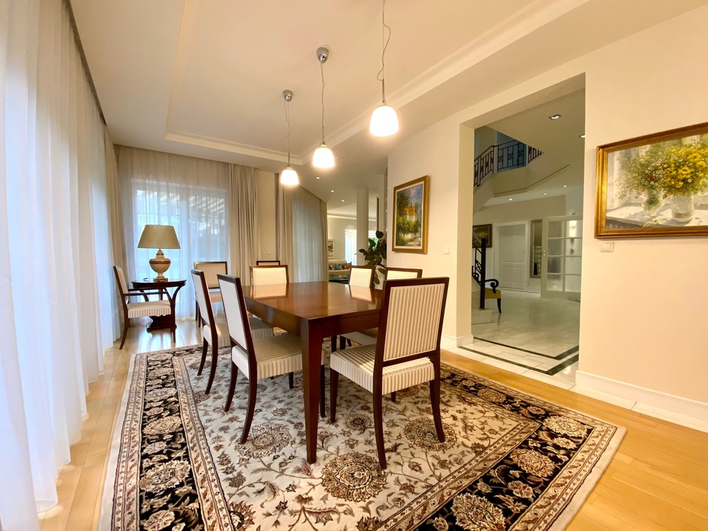 Dom wolnostojący o pow. 320 m2. Wykończony w wysokim standardzie na potrzeby właścicieli. Dom wyróżnia się pięknymi panoramicznymi oknami w salonie (z widokiem na basen i pięknie zachowany ogród, ekspozycja zachodnia), reprezentacyjnym i wysokim na dwie kondygnacje holem wejściowym, wygodnym układem pomieszczeń oraz świetnym stanem technicznym. Dom całkowicie umeblowany, utrzymany w idealnej czystości.