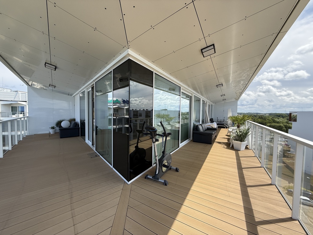 Do lokalu przynależy taras balkonowy o pow. 64 m2 z wyjściem z pokoju dziennego i dwóch sypialni, oraz na poziomie dachu - słoneczny taras widokowy o pow. 90 m2, na który jest właz dachowy sterowany elektrycznie. Taras dachowy jest oddzielony od sąsiednich apartamentów wysoką, nieprzejrzystą przesłoną, gwarantującą prywatność. Od strony morza został oszklony, co chroni przed wiatrem, ale jednocześnie gwarantuje piękny widok na morze. Balkon i taras wykończone są deską kompozytową.