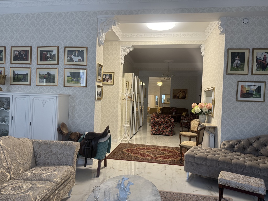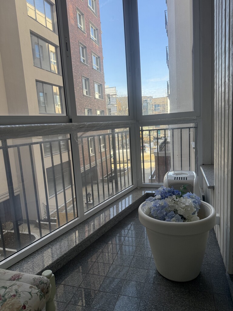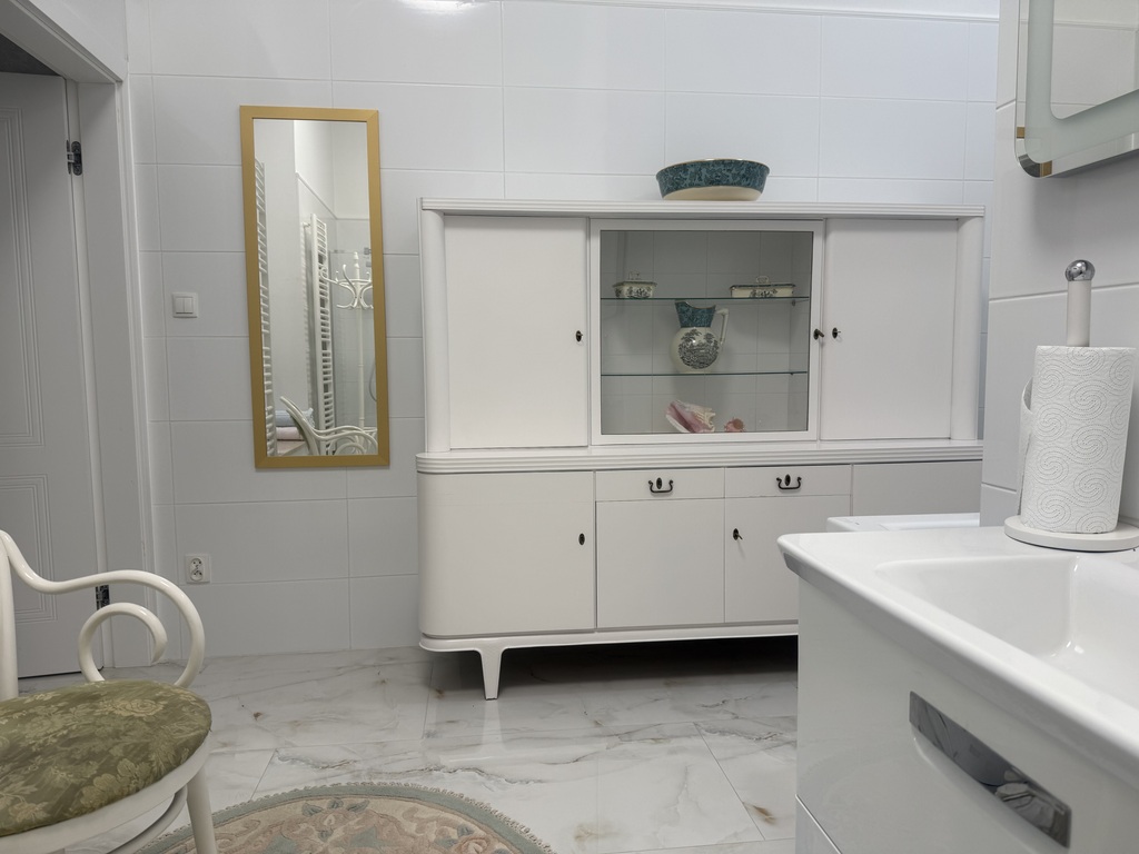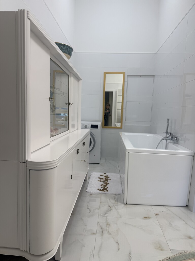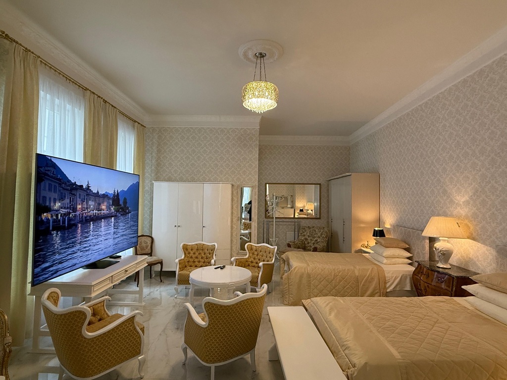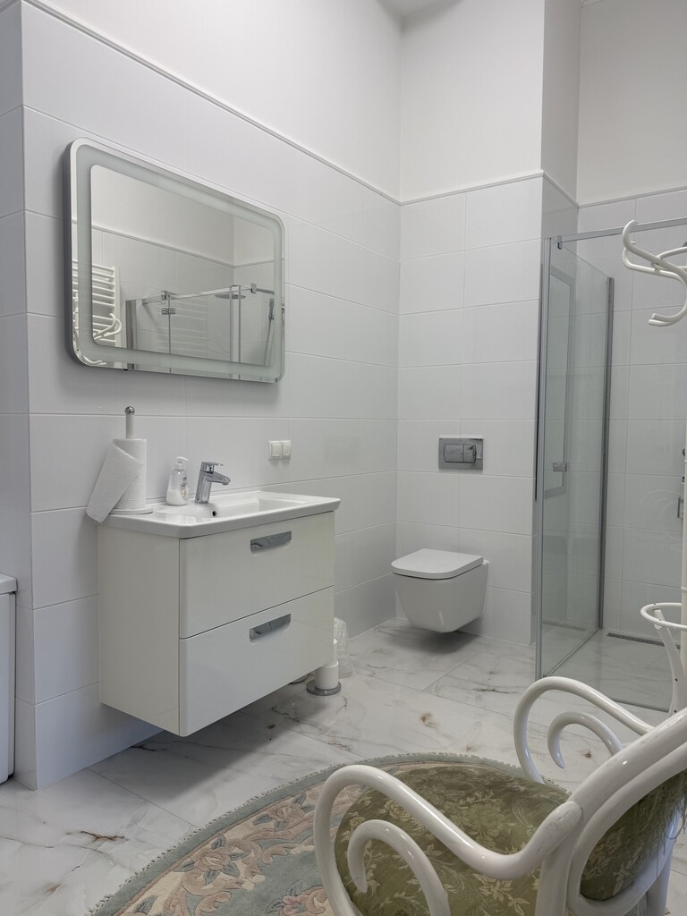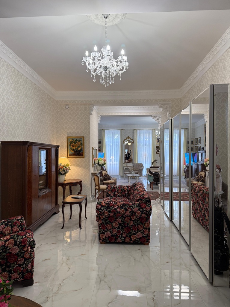 Na całej powierzchni apartamentu duże kafle imitujące posadzkę marmurową, okna wysokie, białe nowej generacji, trzyszybowe, na ścianach eleganckie tapety wysokiej jakości w klasycznym wzorze, przy suficie wysokie , białe listwy gustownie komponujące się z charakterem wykończenia.