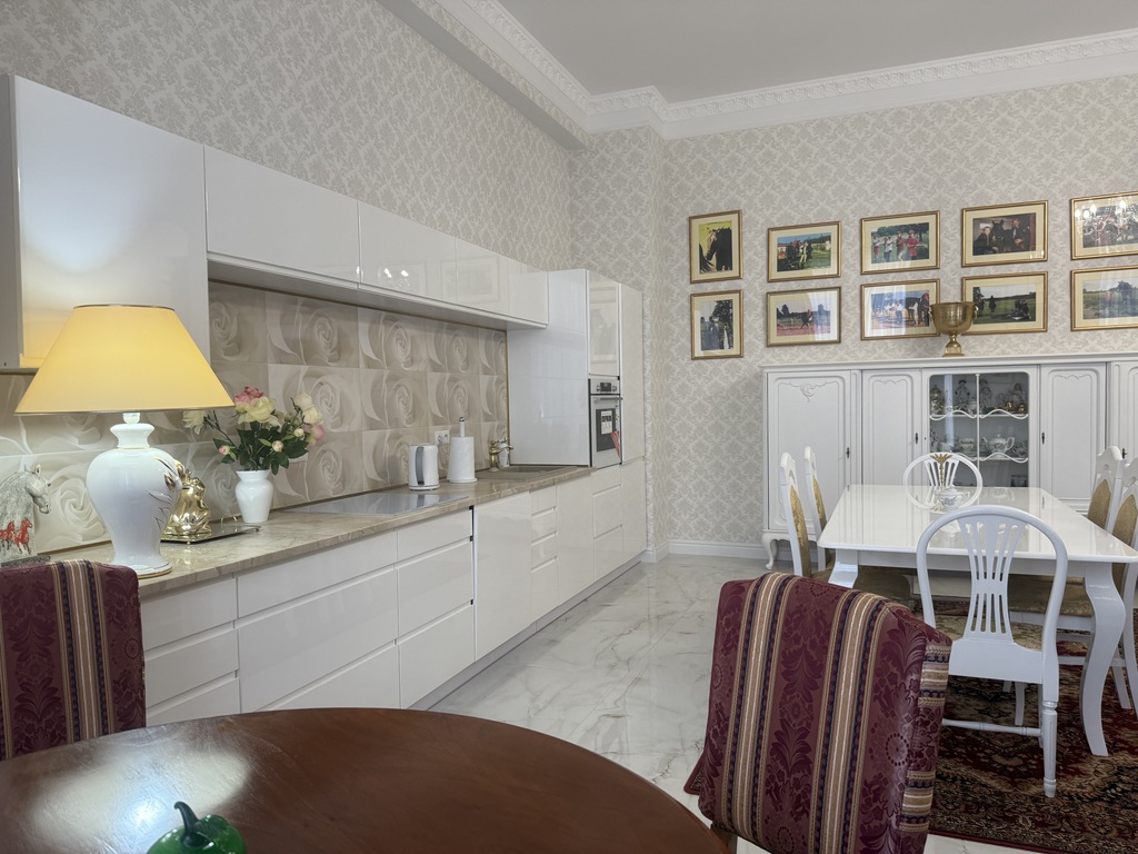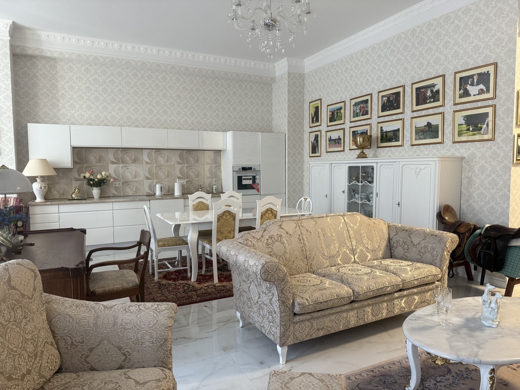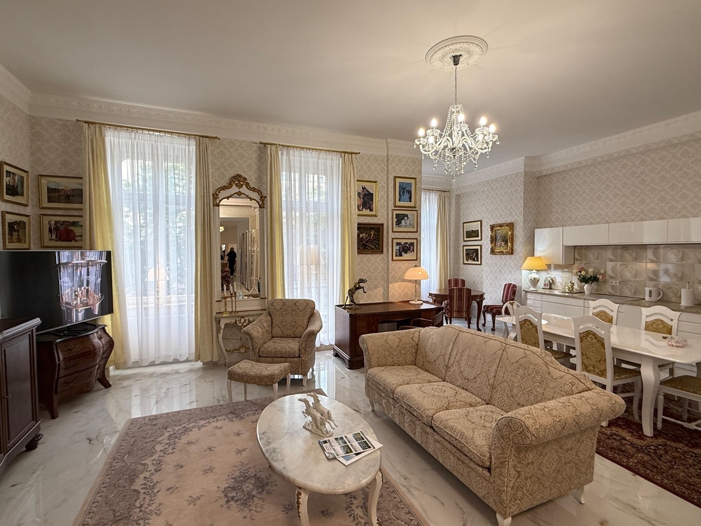 Ekskluzywny apartament w Śródmieściu Szczecina, usytuowany na pierwszym piętrze, w pięknie odremontowanej, zabytkowej Kamienicy z windą i parkingiem w hali garażowej na poziomie -1. Powierzchnia apartamentu to 152 m kw, pierwotnie zaprojektowana pod 5 pokoi obecnie obejmuje : przestronną, w pełni umeblowaną i wyposażoną w nowy (nie używany) sprzęt kuchnię, w kolorze śnieżnej, połyskującej bieli, odpowiedni do niej salon z wyjściem na balkon od strony ul.Śląskiej, równie dużą, pięknie doświetlona sypialnia z wyjściem na kolejny balkon oraz w pełni wyposażona łazienka z wanną, kabiną prysznicową.